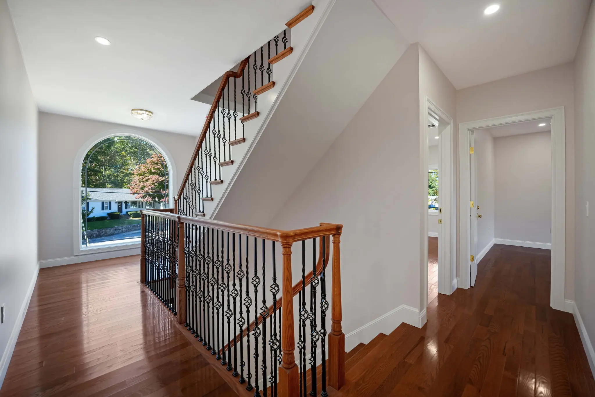 Inside, the home features unique tile work throughout, a kitchen finished with large format floor tile and double stack kitchen cabinets. Nearly all of the bathrooms include fully custom tiled showers, and a large arch top window illuminates the 3-level stairwell, built with a continuous red oak handrail, adorned with iron basket balusters.